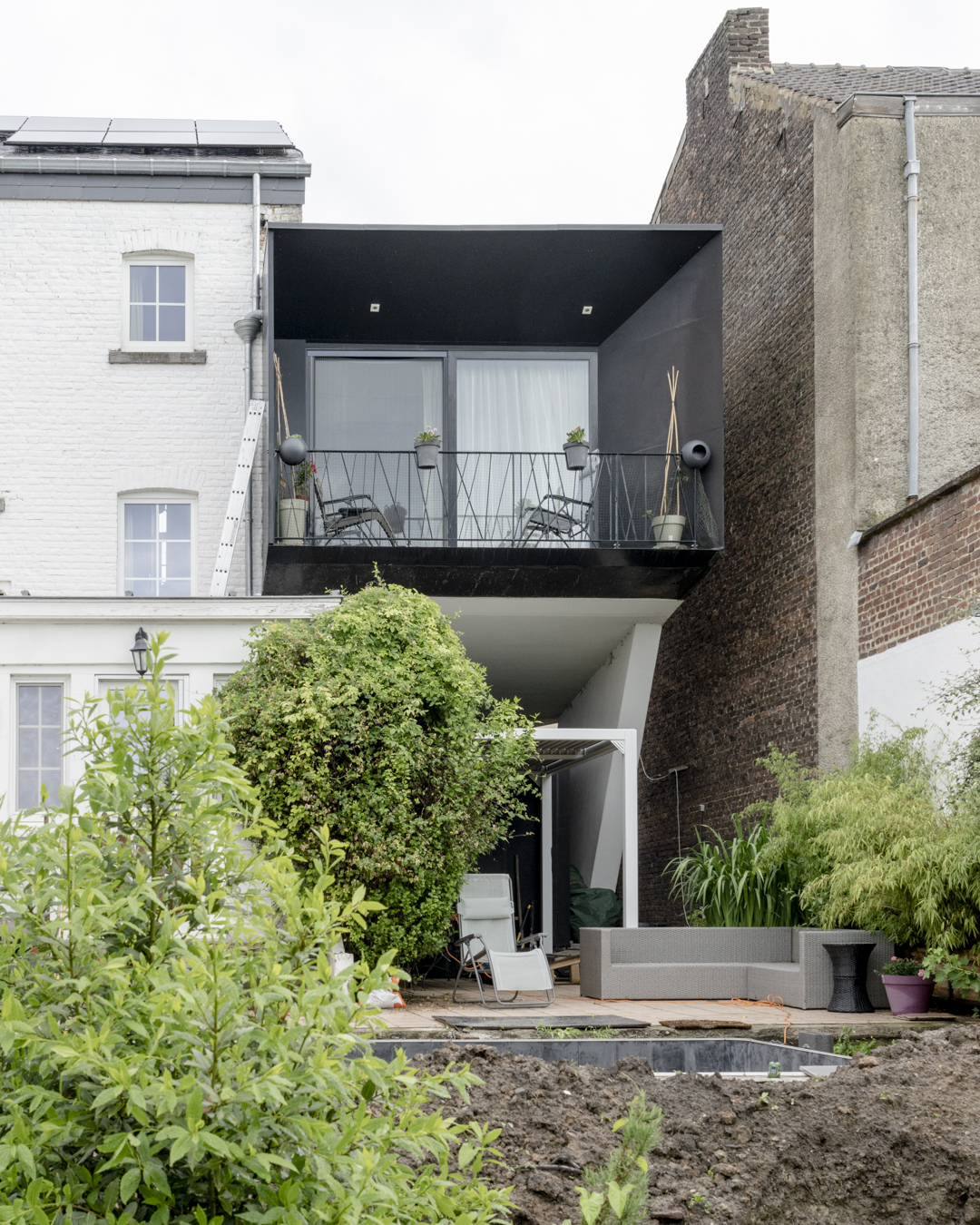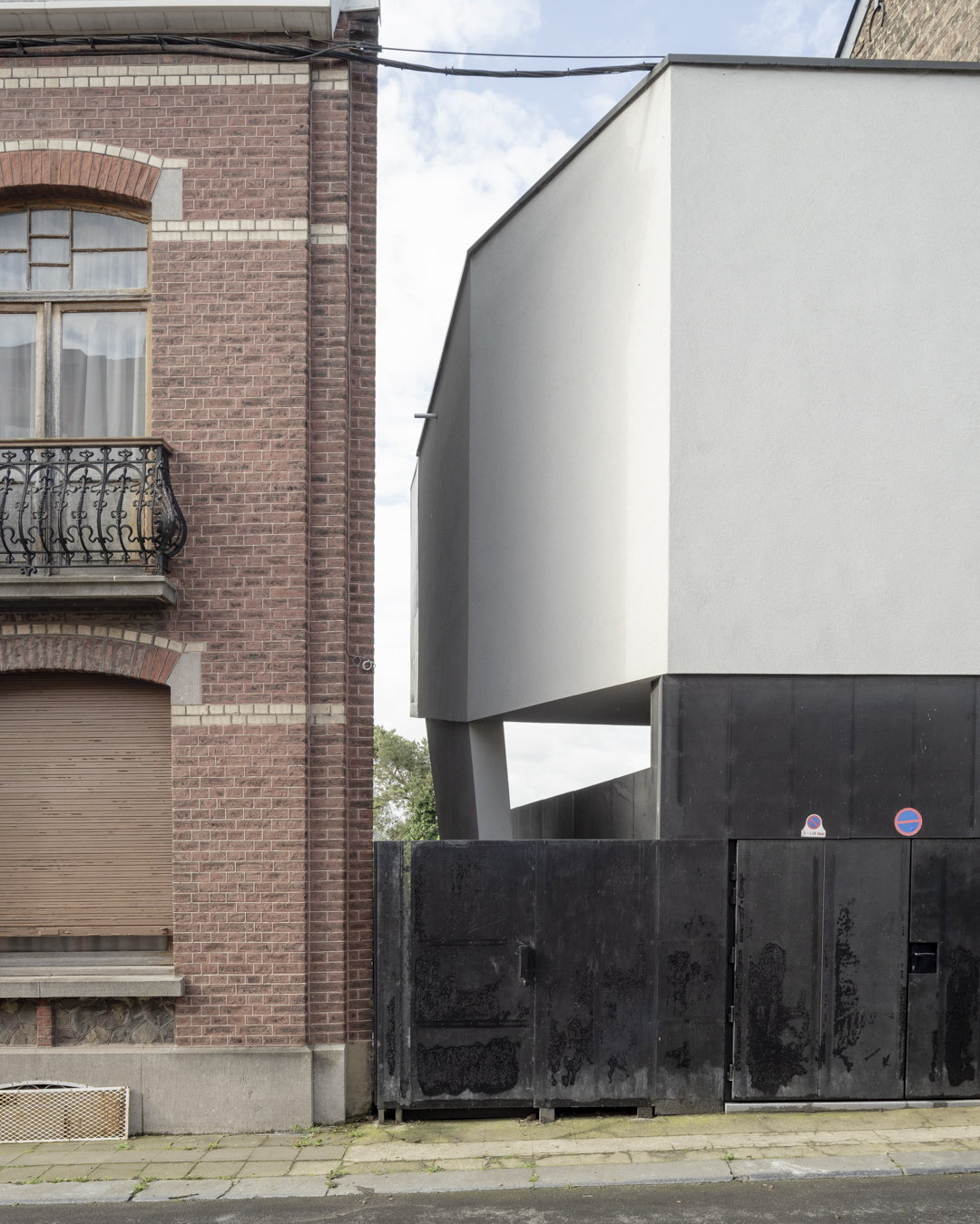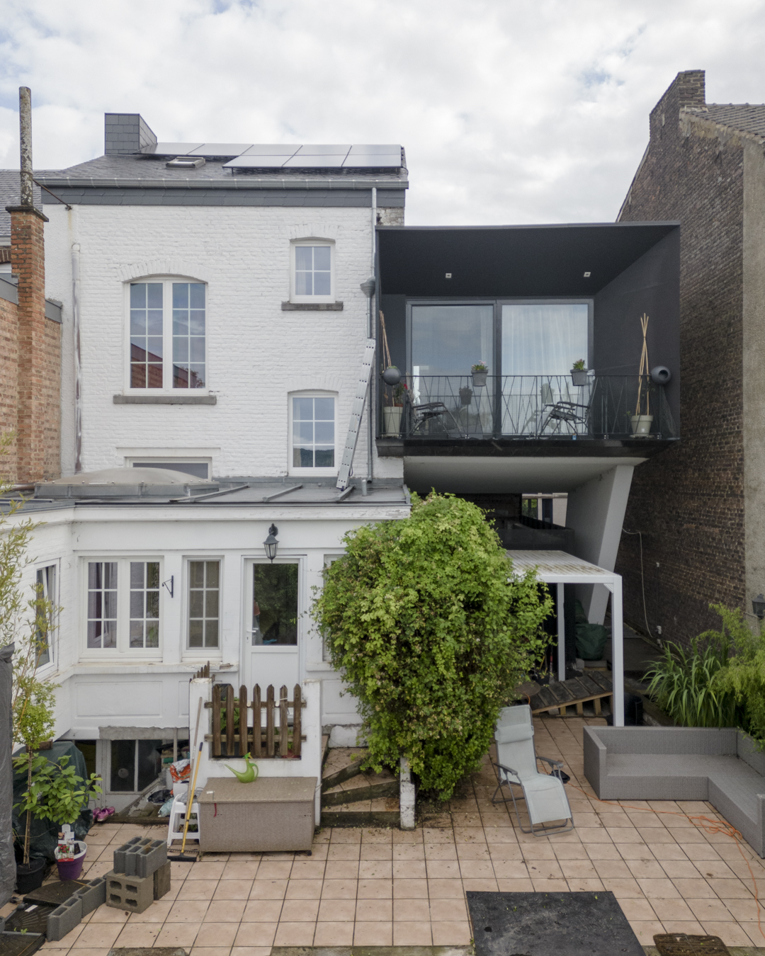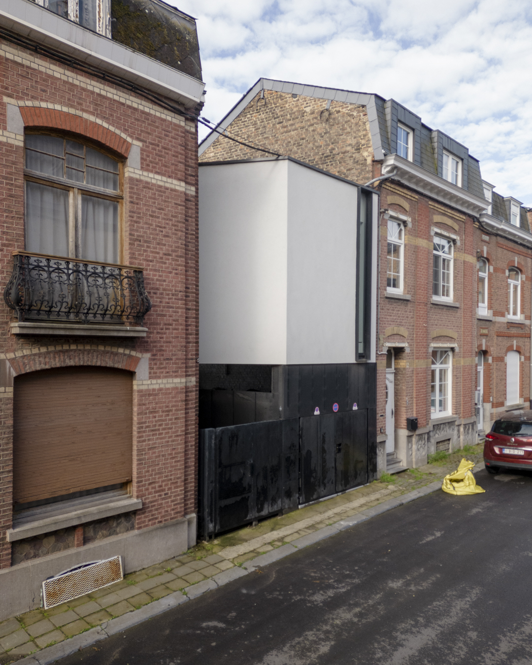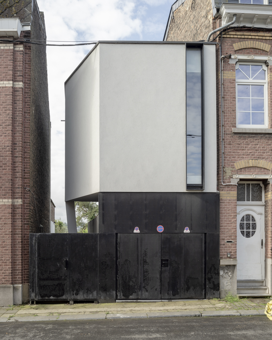 Le contraste convoqué par l’extension met en lumière l’architecture existante. Le geste simple et rationnel qui a guidé son dessin et sa volumétrie, favorise une intégration naturelle avec les bâtis voisins. La simplicité des matériaux choisis renforce cet effet : les panneaux noirs de la façade du garage se détachent du volume supérieur en crépi clair.