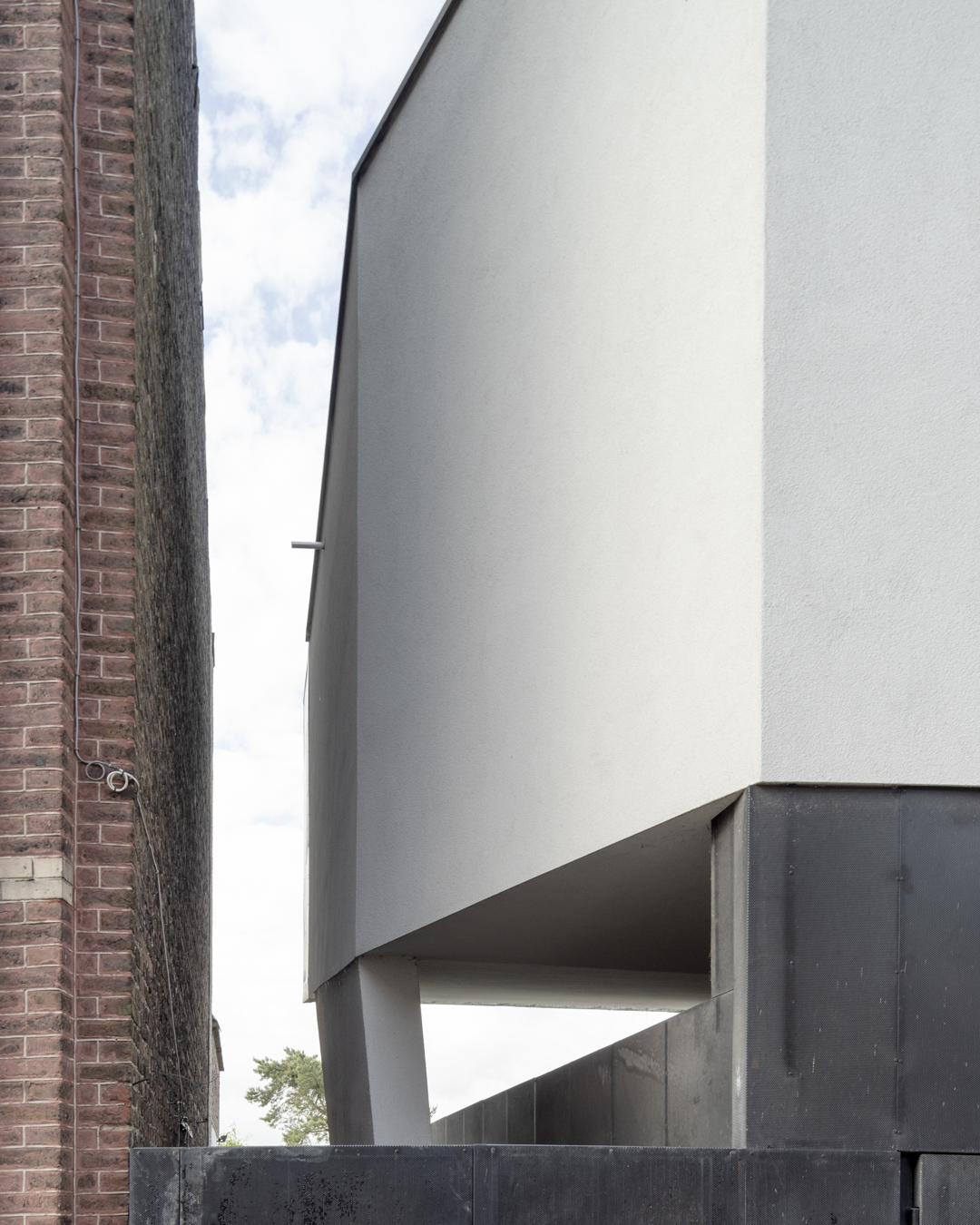 Pour autant, la forme de l’extension n’est pas simpliste, elle est même assez osée. En effet, le volume ne s’intègre pas parallèlement au pignon voisin. À la place, il file en léger entonnoir. Un élégant voile de béton soulage le garage dont les fondations ne pourraient supporter l’entièreté du poids de l’extension.