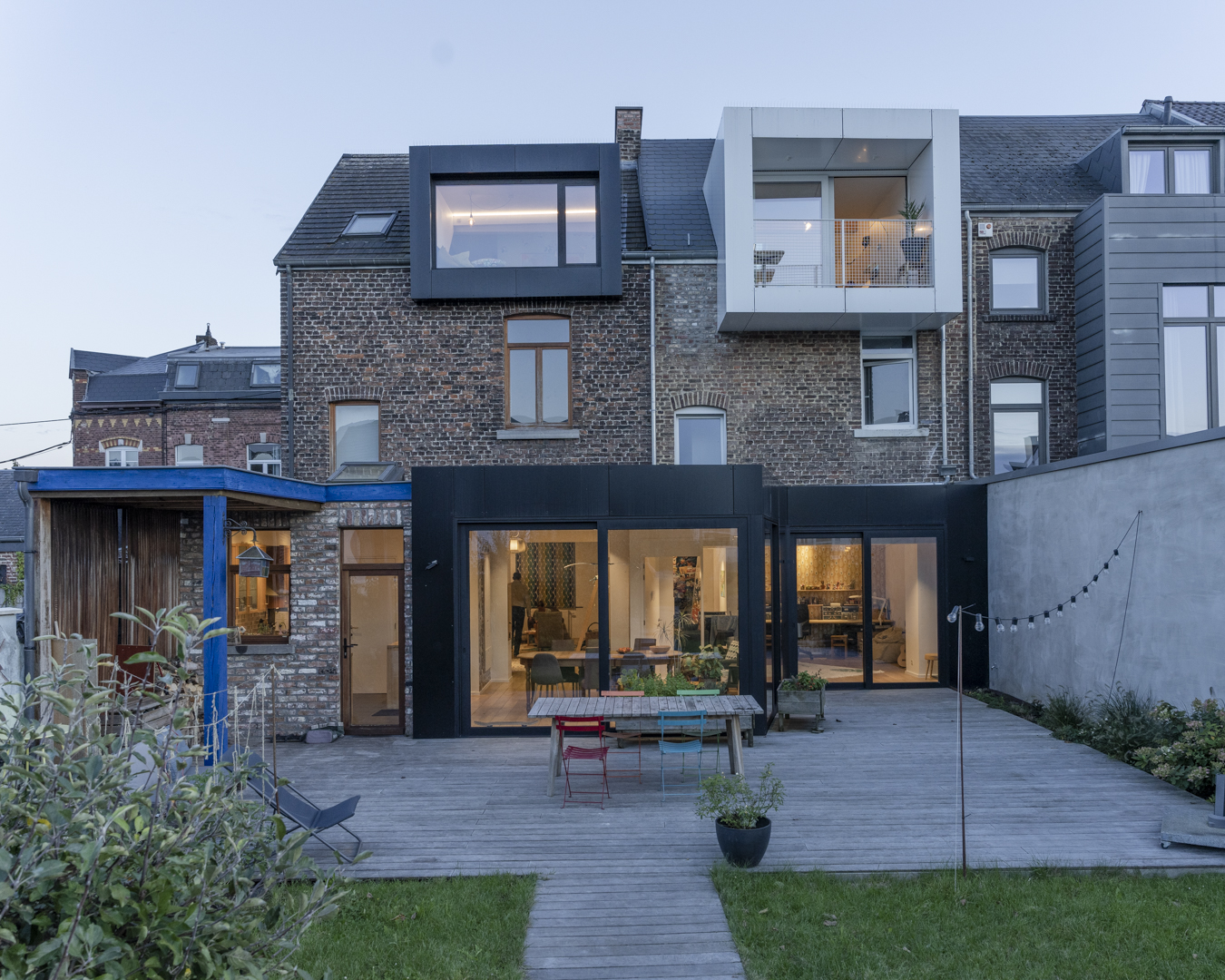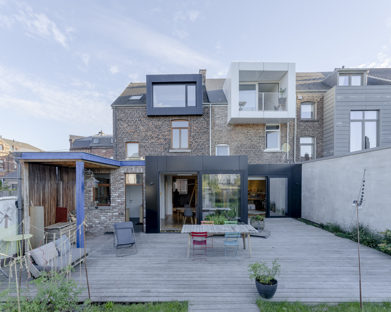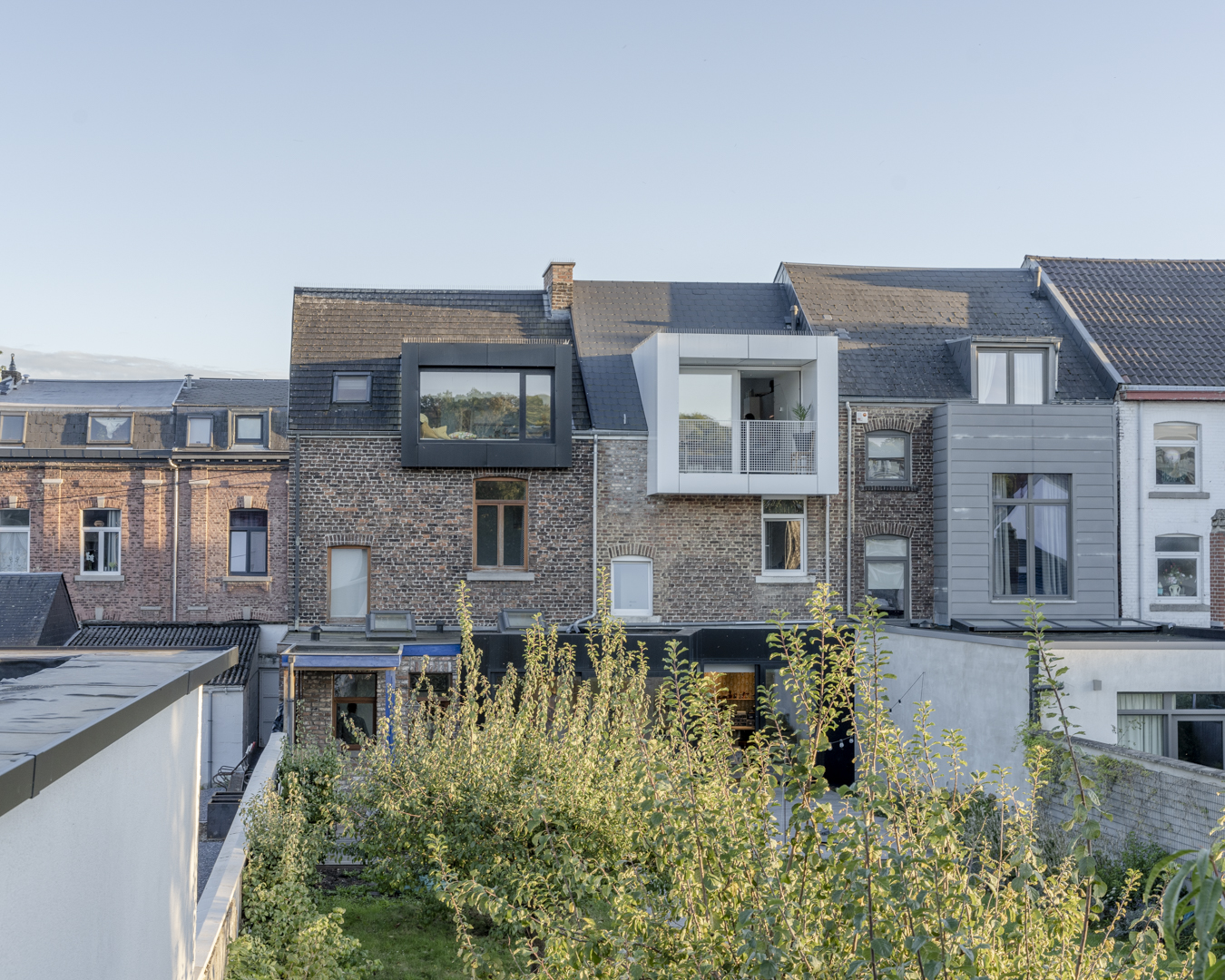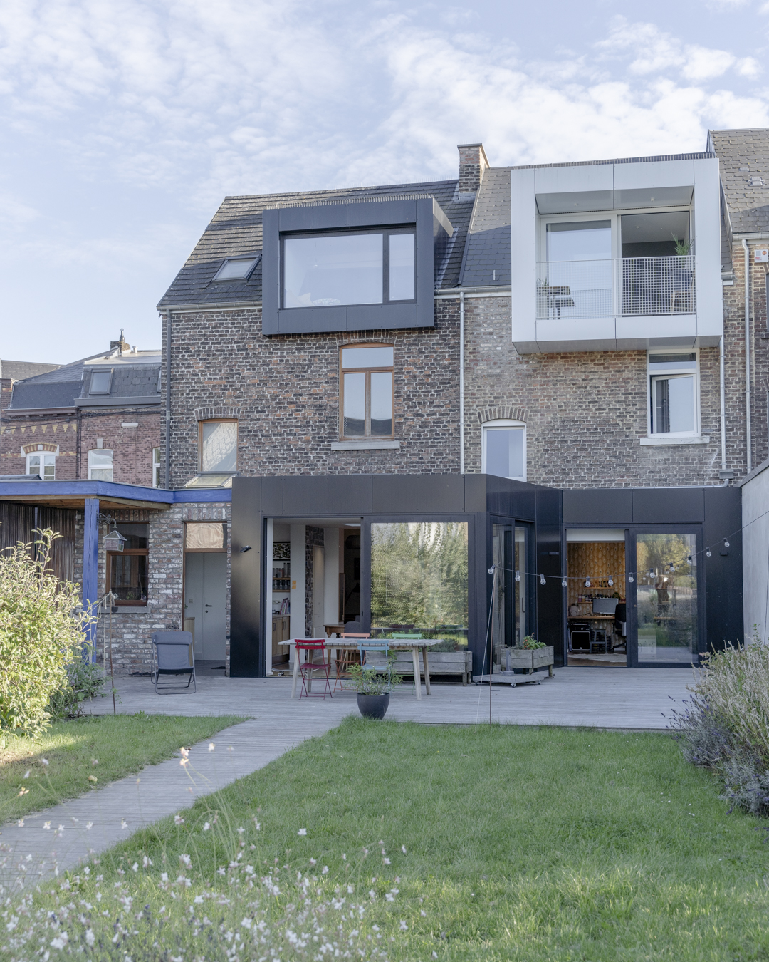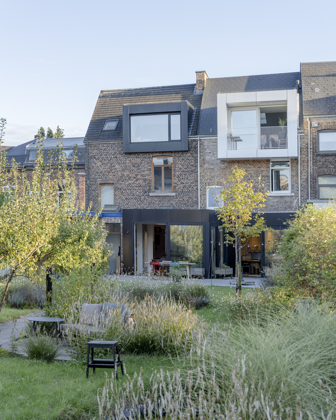 La première étape vise à pousser les murs du rez-de-chaussée de la maison familiale afin d’y augmenter l’espace de vie (cuisine et salle à manger). Dans la maison mitoyenne, le rez-de-chaussée désormais relié à celui d’à côté remplit bien des fonctions. Pensé comme un lieu polyvalent (où la chambre d’ami, la douche et le bureau pourront se transformer en logement tout à fait séparé) cet espace accueillera dans un futur plus ou moins lointain les grands-parents. Troisième volet : l’aménagement en surplomb d’un duplex lumineux doté d’un joli balcon avec vue sur la Meuse. Enfin, l’espace extérieur, véritable petit havre de détente, s’étale des bâtiments jusqu’au halage.