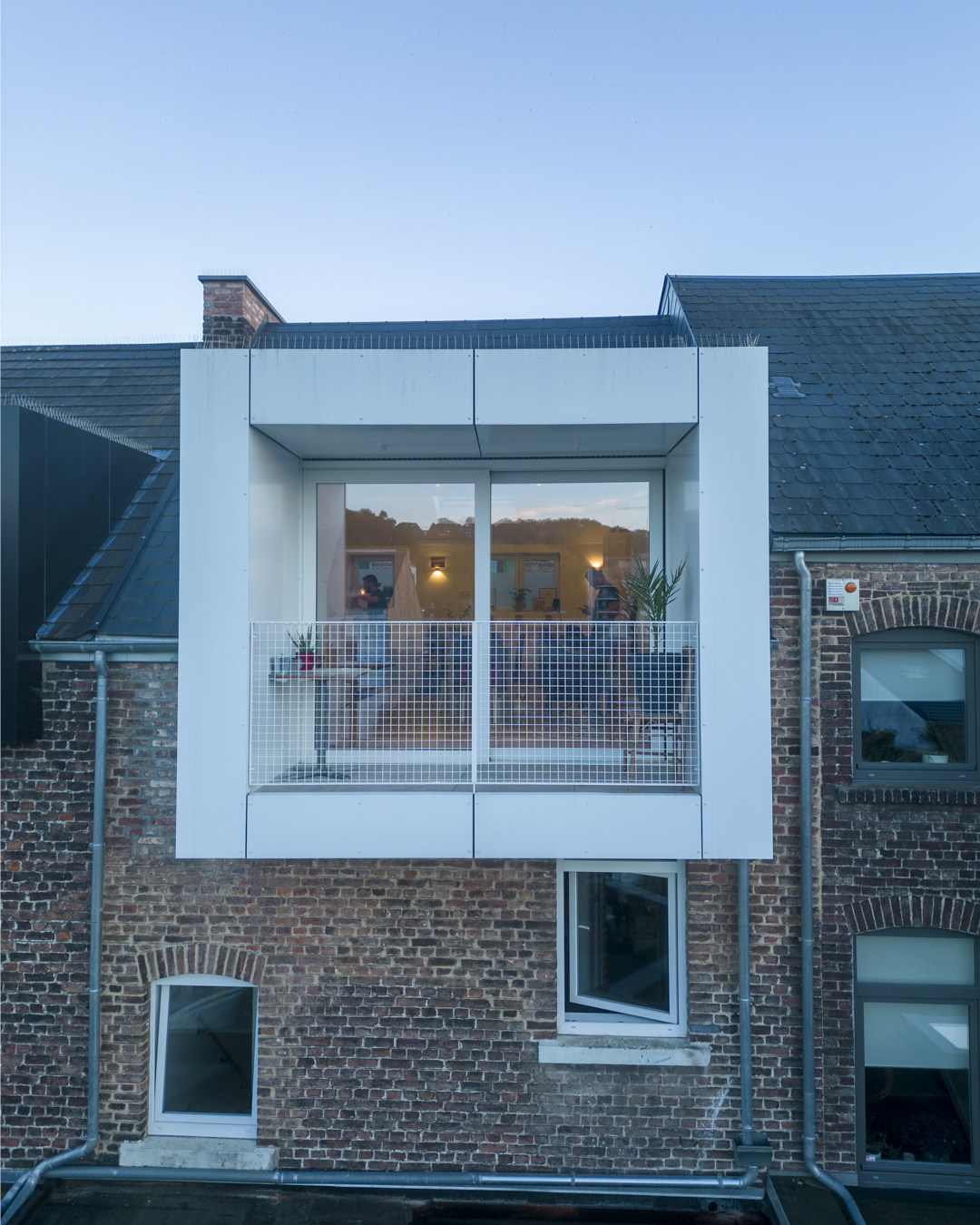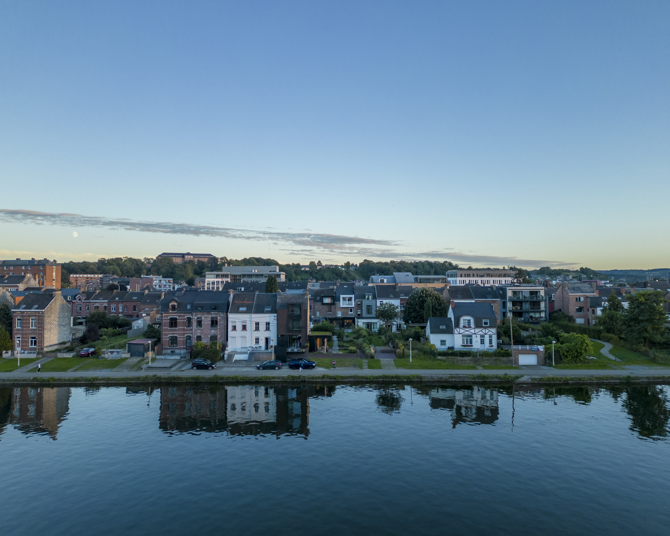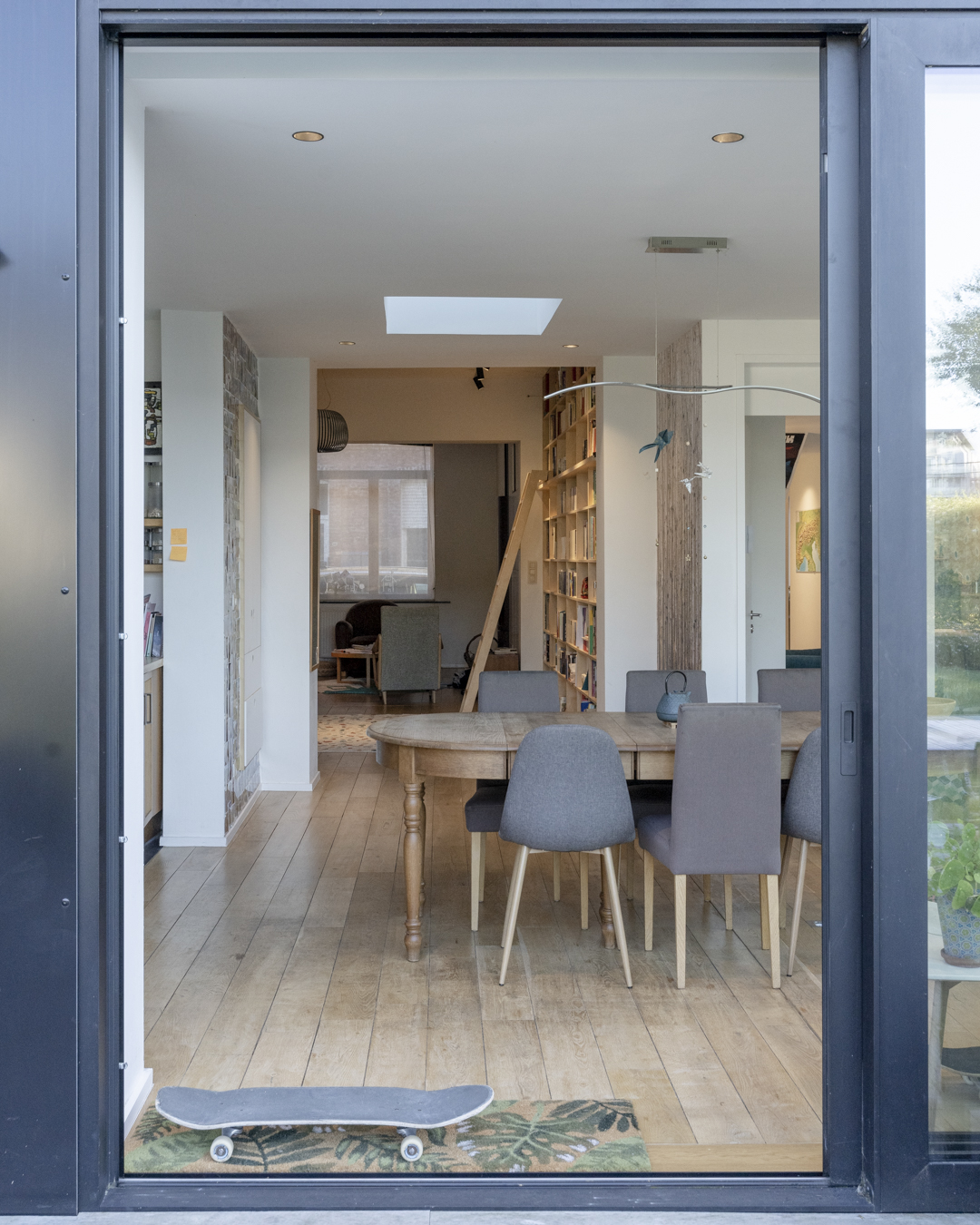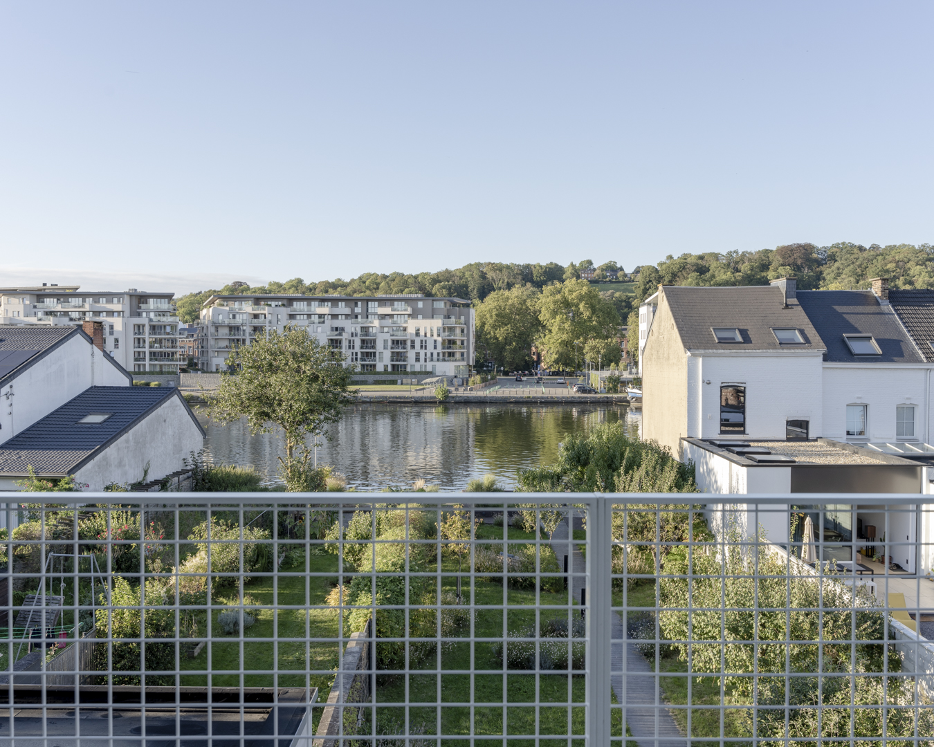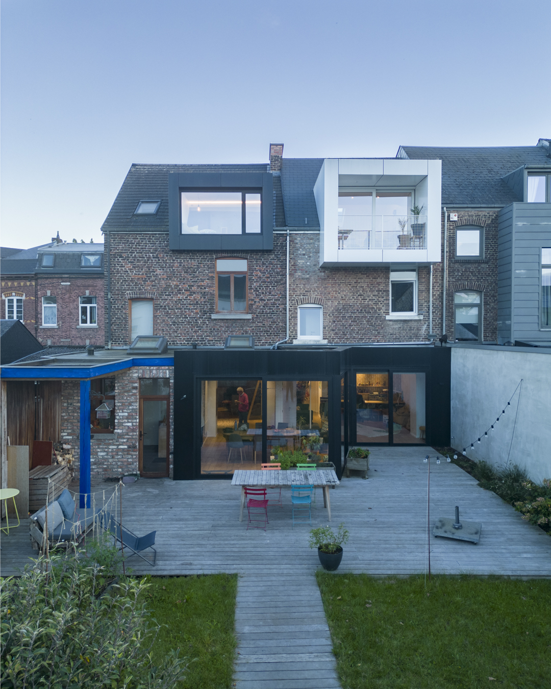 La première étape vise à pousser les murs du rez-de-chaussée de la maison familiale afin d’y augmenter l’espace de vie (cuisine et salle à manger). Dans la maison mitoyenne, le rez-de-chaussée désormais relié à celui d’à côté remplit bien des fonctions. Pensé comme un lieu polyvalent (où la chambre d’ami, la douche et le bureau pourront se transformer en logement tout à fait séparé) cet espace accueillera dans un futur plus ou moins lointain les grands-parents. Troisième volet : l’aménagement en surplomb d’un duplex lumineux doté d’un joli balcon avec vue sur la Meuse. Enfin, l’espace extérieur, véritable petit havre de détente, s’étale des bâtiments jusqu’au halage.