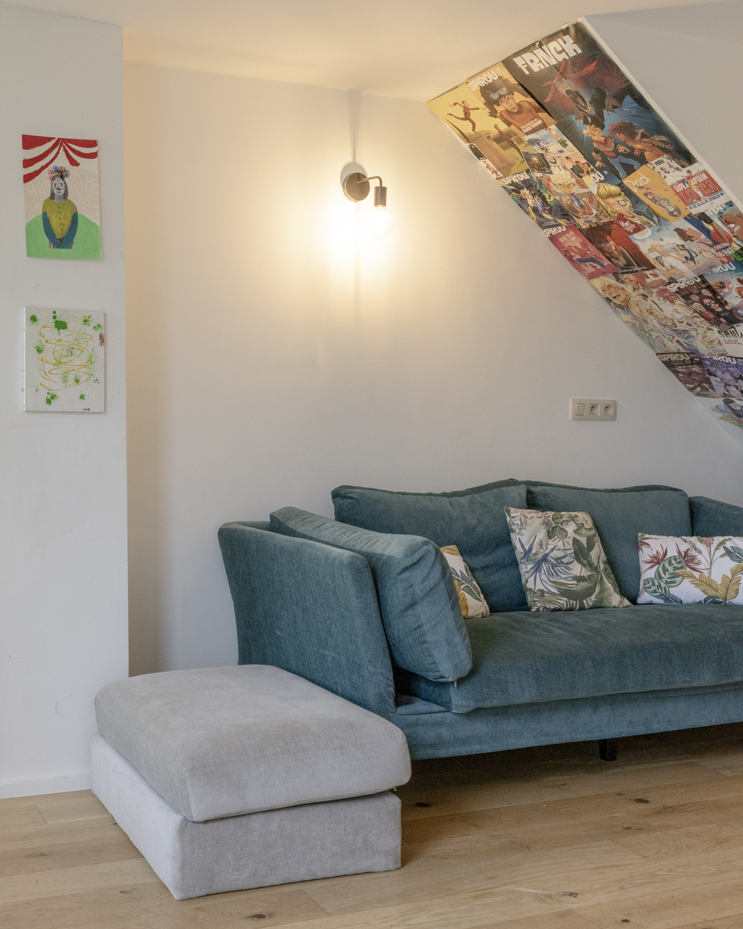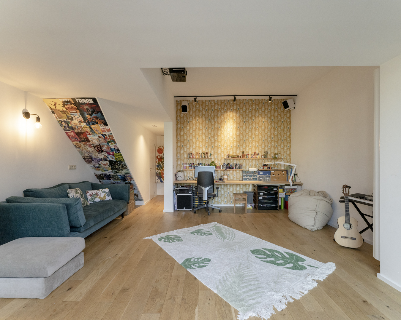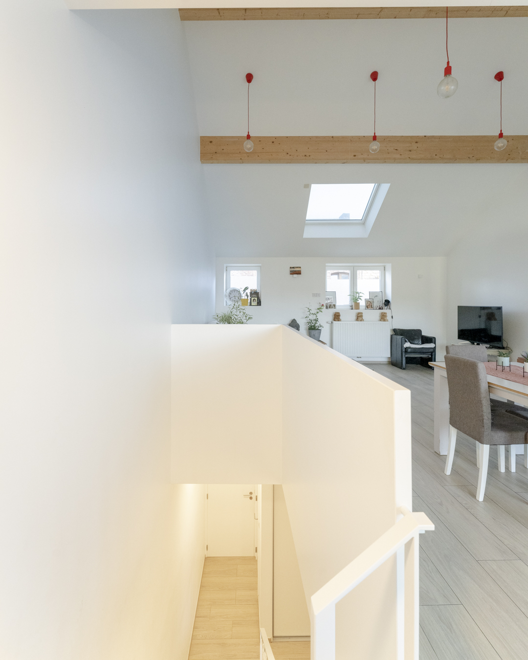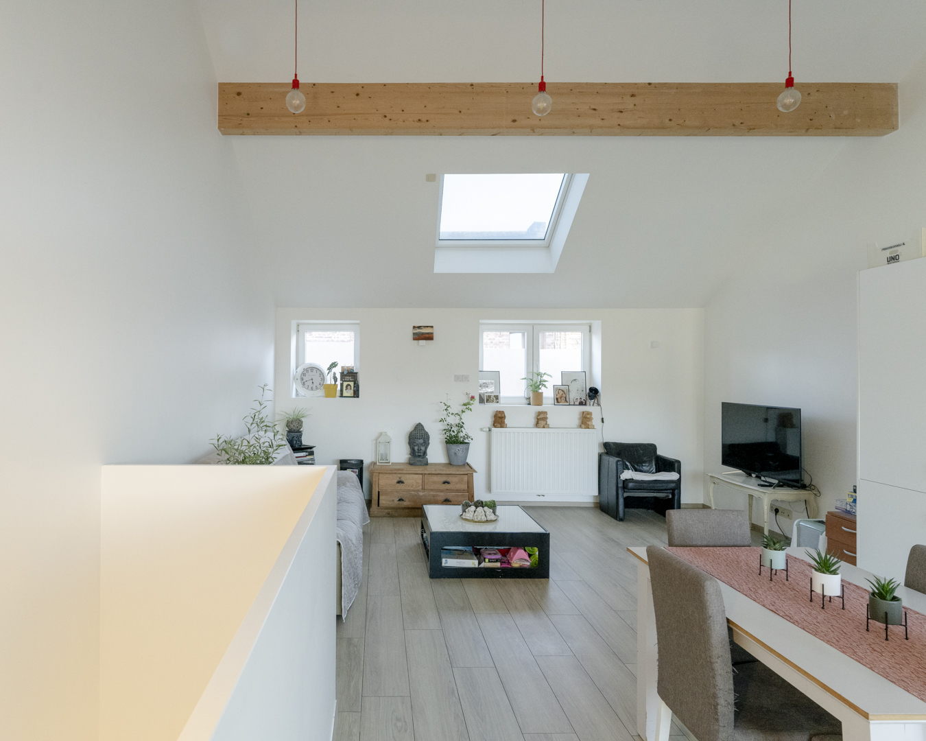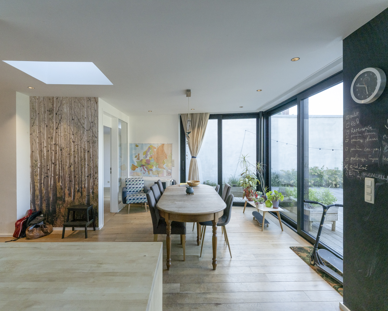 La première étape vise à pousser les murs du rez-de-chaussée de la maison familiale afin d’y augmenter l’espace de vie (cuisine et salle à manger). Dans la maison mitoyenne, le rez-de-chaussée désormais relié à celui d’à côté remplit bien des fonctions. Pensé comme un lieu polyvalent (où la chambre d’ami, la douche et le bureau pourront se transformer en logement tout à fait séparé) cet espace accueillera dans un futur plus ou moins lointain les grands-parents. Troisième volet : l’aménagement en surplomb d’un duplex lumineux doté d’un joli balcon avec vue sur la Meuse. Enfin, l’espace extérieur, véritable petit havre de détente, s’étale des bâtiments jusqu’au halage.