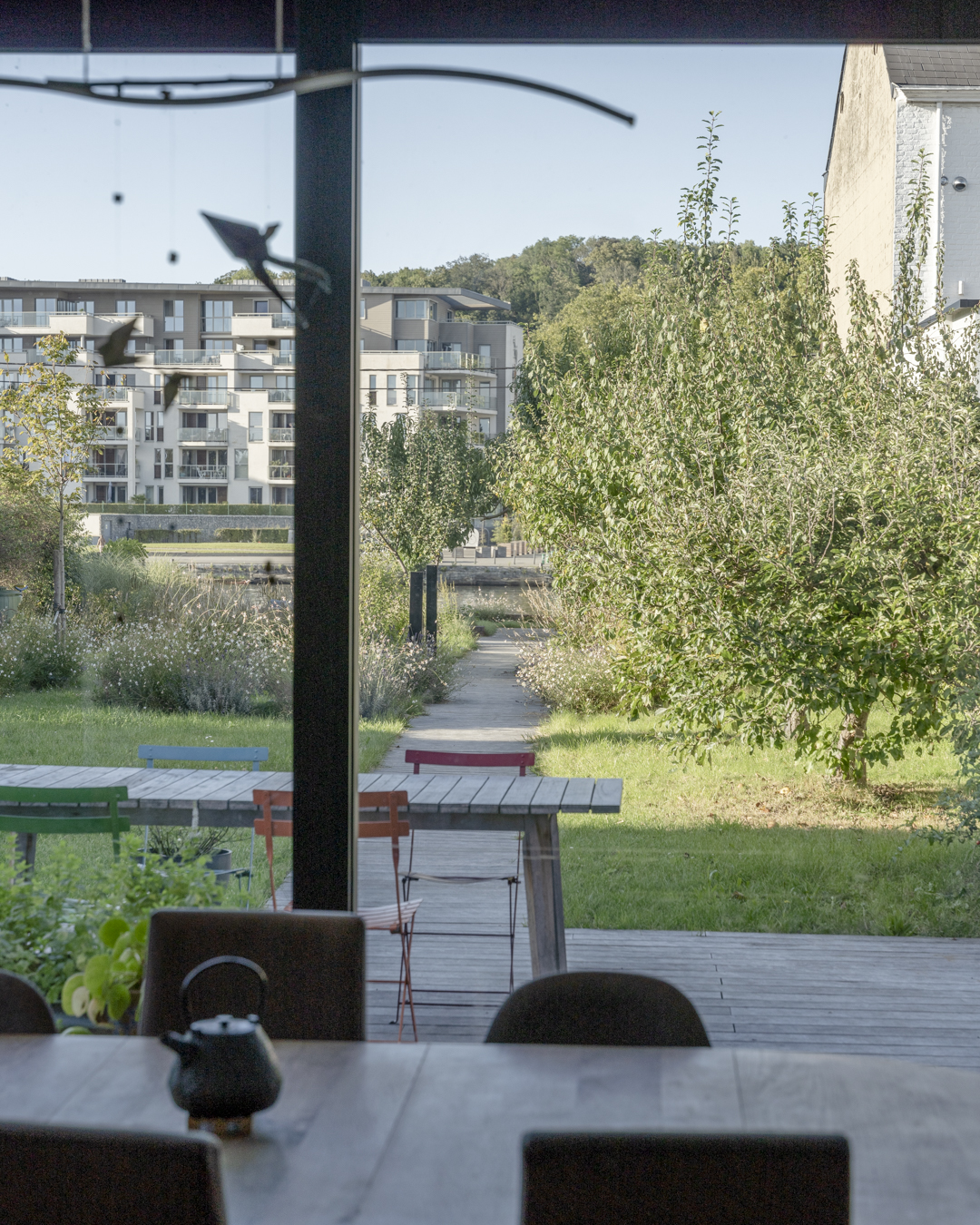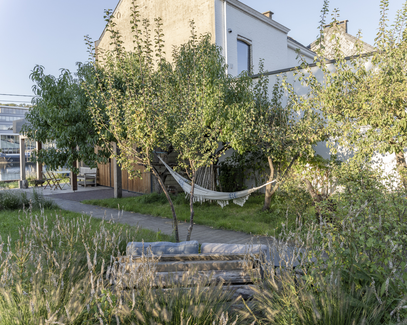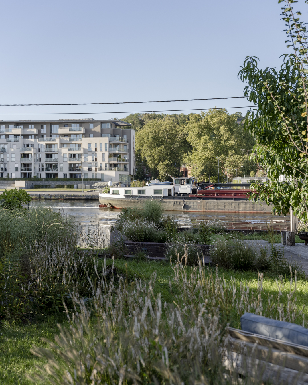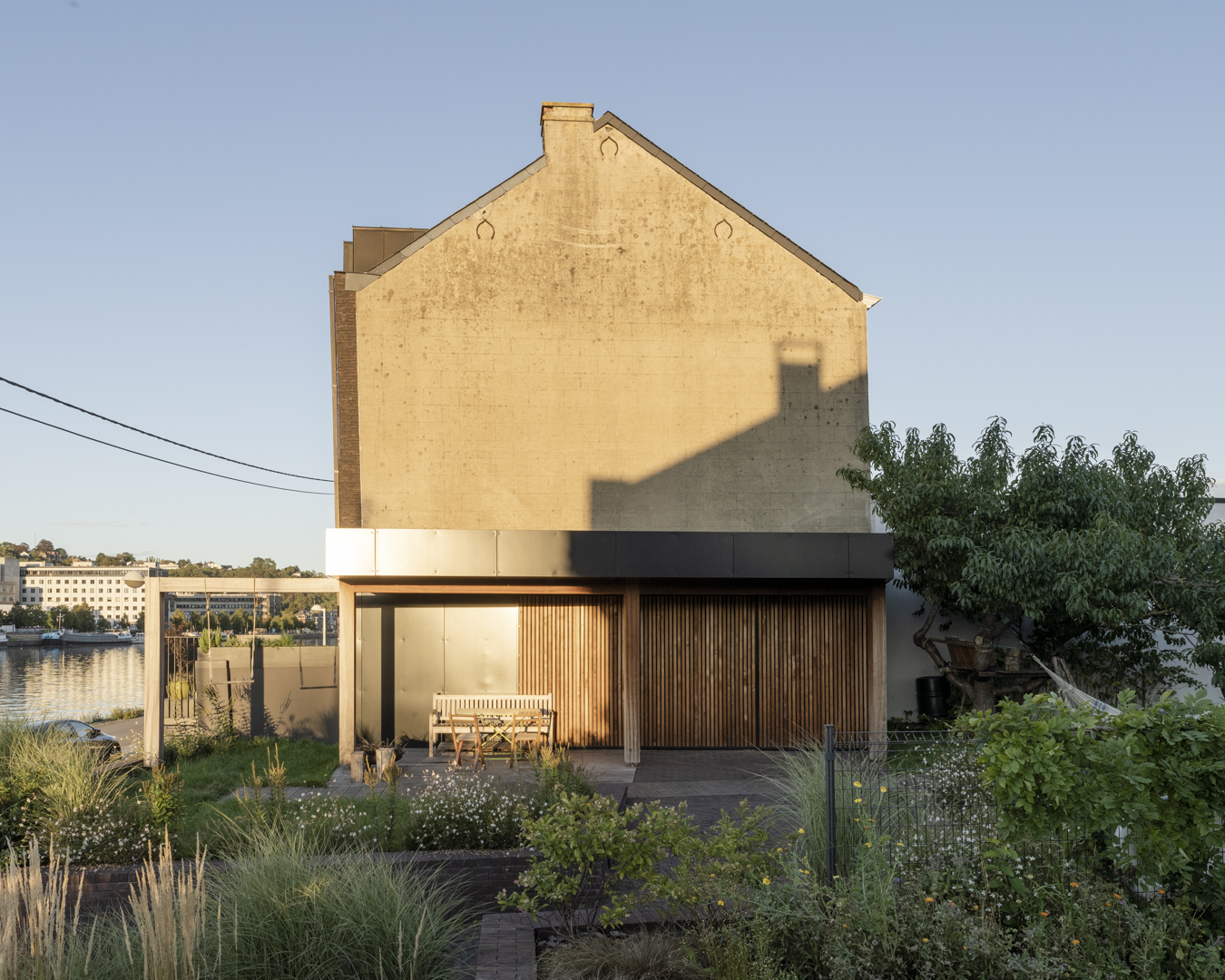 La volonté des habitants de garder un lien fort avec l’eau a orienté les choix d’aménagement extérieur. Pour préserver une certaine intimité, on a privilégié des solutions végétales. La vie du halage fait partie intégrante de ce lieu de vie et le filtrage par la végétation permet de se soustraire à la vue des passants sans perdre la connexion au fleuve.