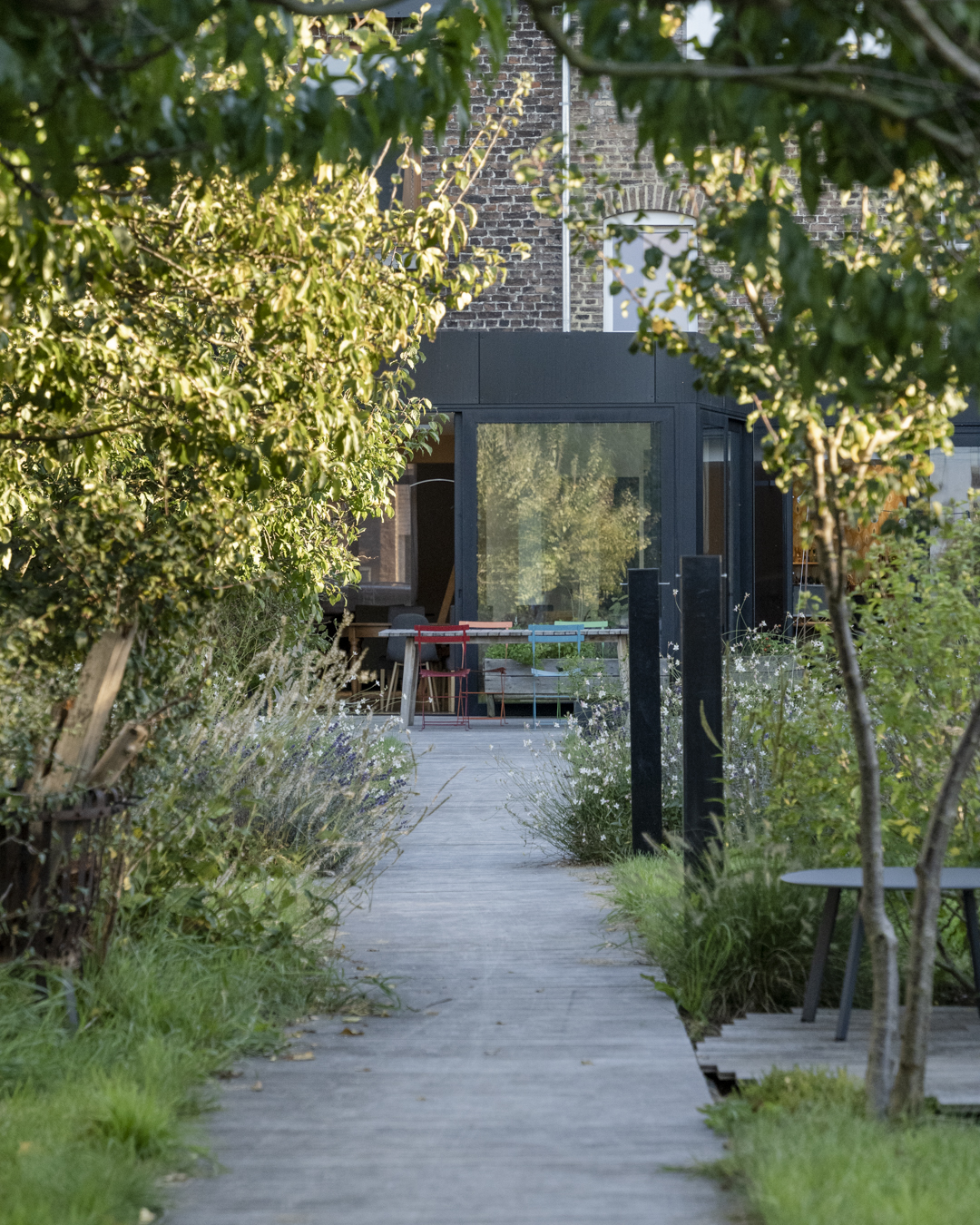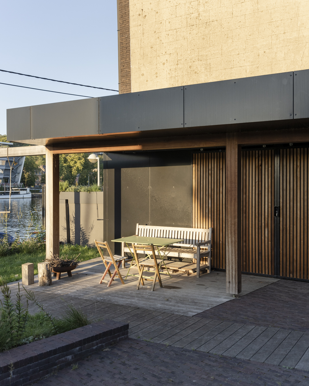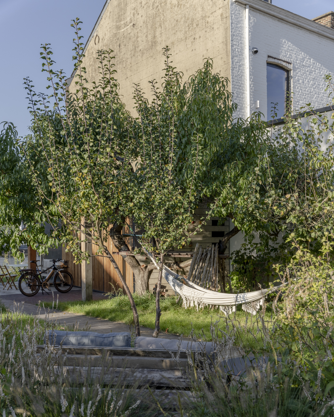L’homogénéité de l’ensemble s’est construite avec le choix de la brique. Aussi bien la rampe qui permet de pallier la différence de niveaux entre le halage et le jardin (un impératif pour les occupants qui utilisent principalement leur vélo pour se déplacer) que les parterres sont couverts de briques. Ce sol contraste avec le bois de la terrasse et répond avec habileté à l’aluminium des façades.