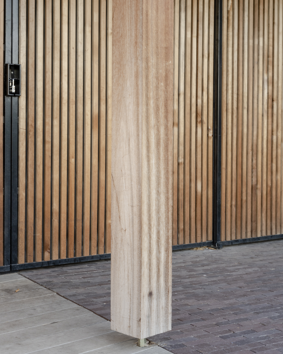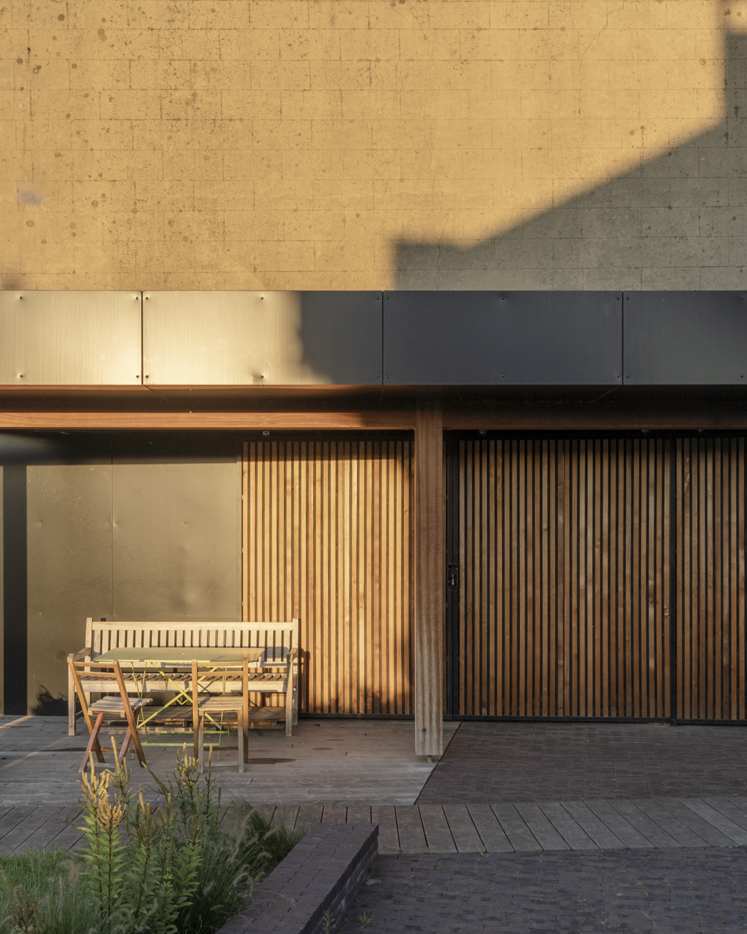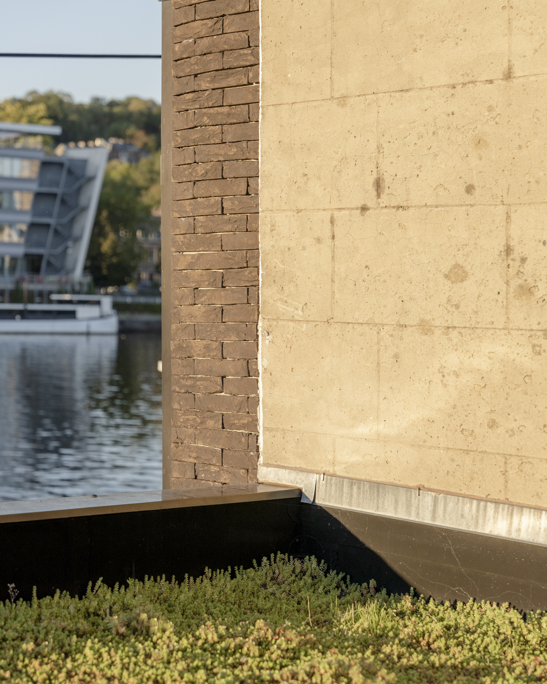 L’homogénéité de l’ensemble s’est construite avec le choix de la brique. Aussi bien la rampe qui permet de pallier la différence de niveaux entre le halage et le jardin (un impératif pour les occupants qui utilisent principalement leur vélo pour se déplacer) que les parterres sont couverts de briques. Ce sol contraste avec le bois de la terrasse et répond avec habileté à l’aluminium des façades.