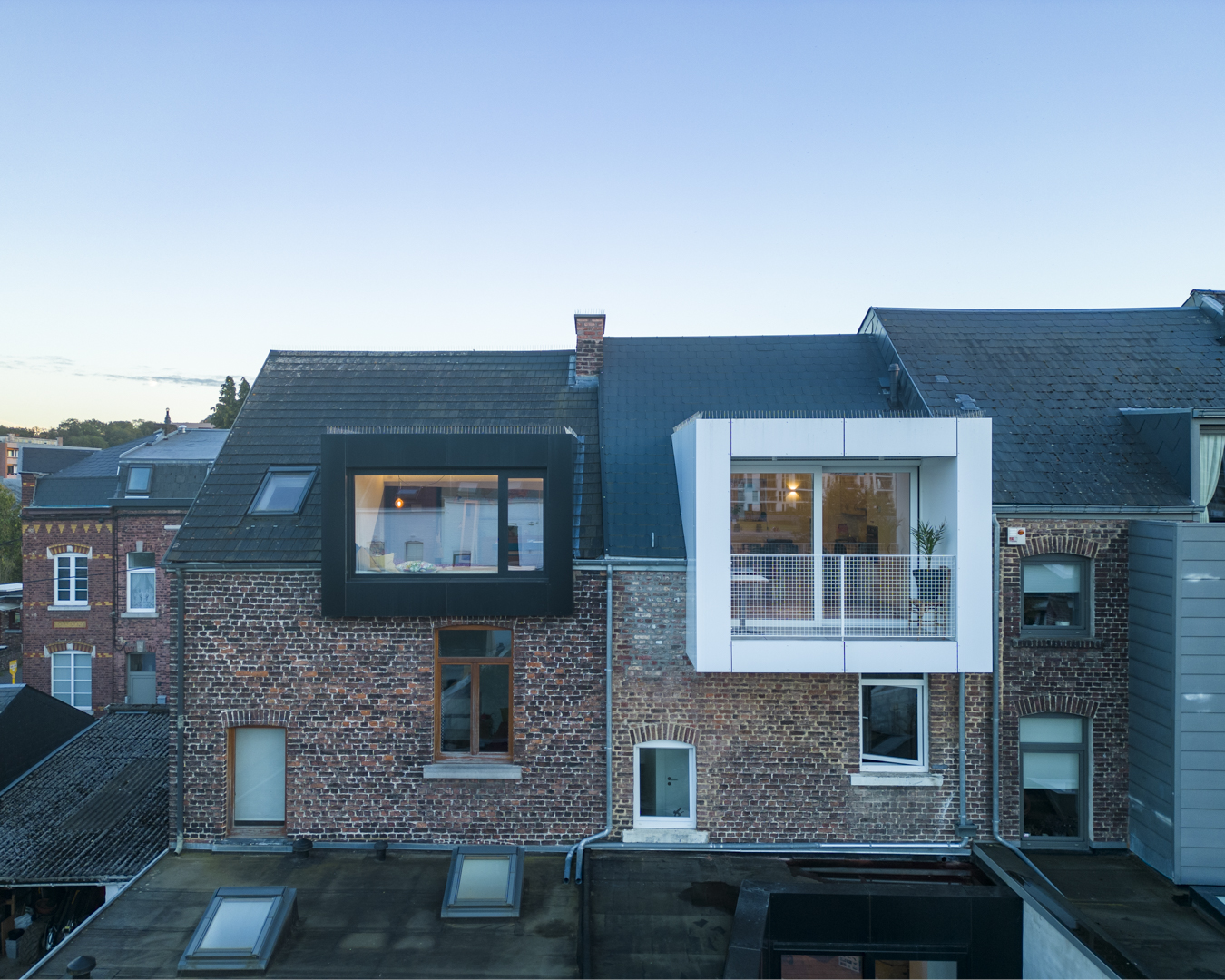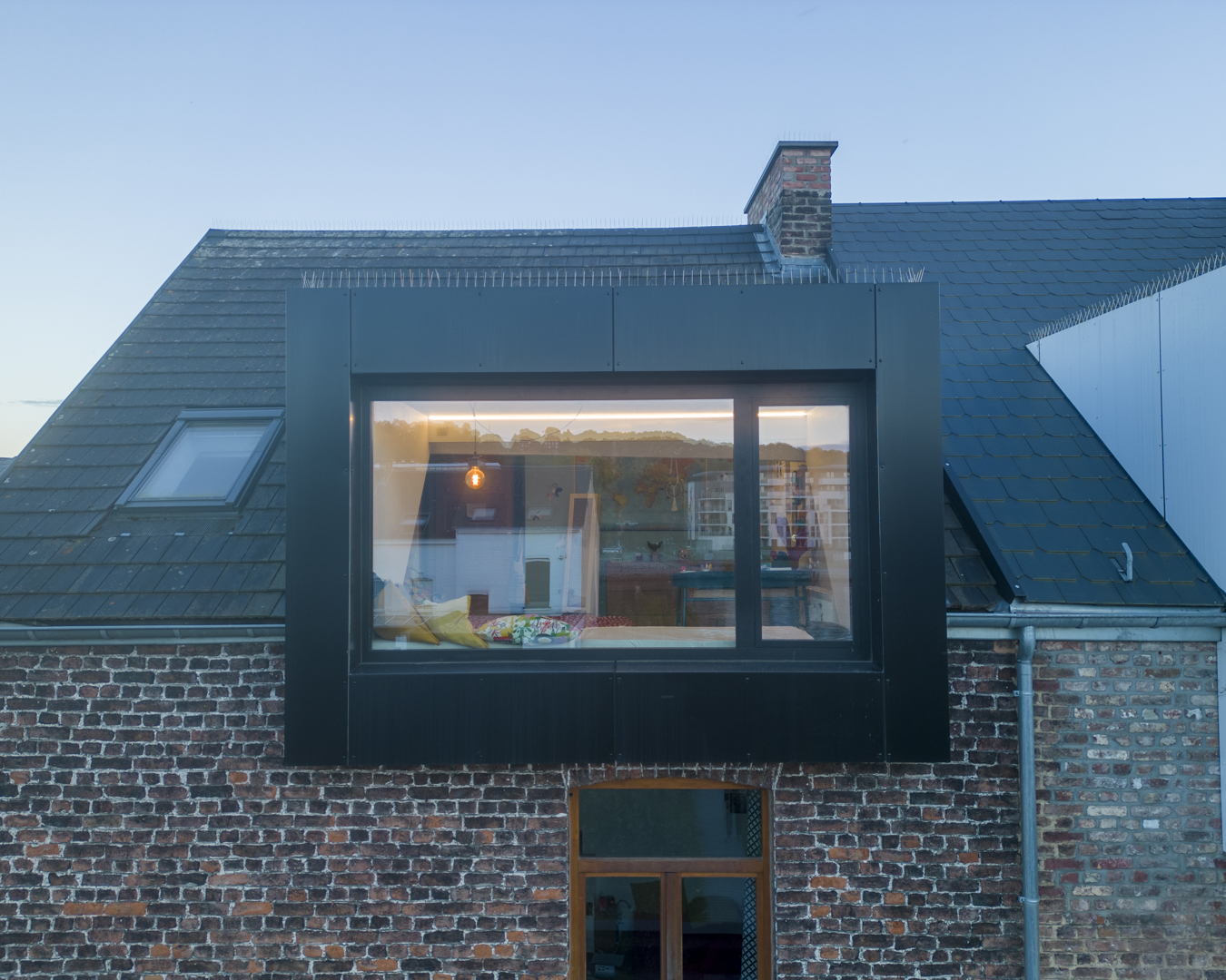 Pour renforcer la cohérence des bâtiments et identifier les fonctions occupées par les différents espaces, un jeu de contraste prend le relais. Le bardage en aluminium noir des deux rez-de-chaussée fait écho à la lucarne en saillie dans la chambre d’une des filles. En contre point, la lucarne blanche du duplex annonce un autre type d’occupation.